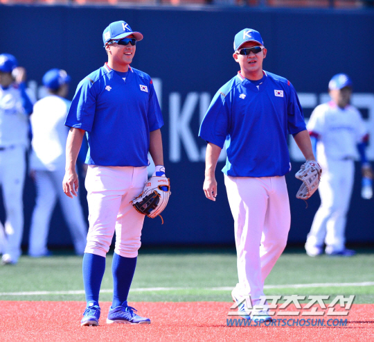 20일 오후 서울 목동야구장에서 2014 인천 아시안게임 한국 야구대표팀의 공식 훈련이 열렸다. 야구대표팀 김민성이 수비 훈련 도중 황재균과 이야기를 나누고 있다.
