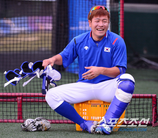 20일 오후 서울 목동야구장에서 2014 인천 아시안게임 한국 야구대표팀의 공식 훈련이 열렸다. 야구대표팀 강민호가 훈련 도중 환하게 웃고 있다.