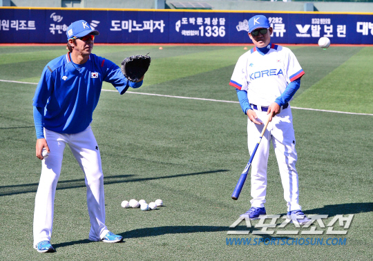 20일 오후 서울 목동야구장에서 2014 인천 아시안게임 한국 야구대표팀의 공식 훈련이 열렸다. 야구대표팀 임창용이 조계현 코치와 선수들의 수비 훈련을 돕고 있다.