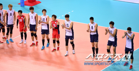 20일 오후 인천 송림체육관에서 2014 인천 아시안게임 남자 배구 한국과 카자흐스탄의 경기가 열렸다. 세트 스코어 3대0으로 승리한 한국 선수들이 관중들에게 인사하고 있다.