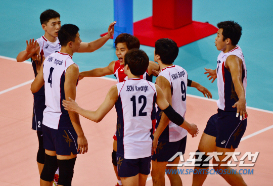 20일 오후 인천 송림체육관에서 2014 인천 아시안게임 남자 배구 한국과 카자흐스탄의 경기가 열렸다. 세트 스코어 3대0으로 승리한 한국 선수들이 환호하고 있다.