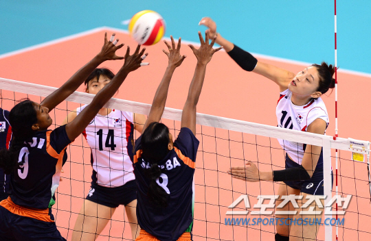 20일 오후 인천 송림체육관에서 2014 인천 아시안게임 여자 배구 한국과 인도의 경기가 열렸다. 김연경이 인도 진영을 향해 공격을 성공시키고 있다.