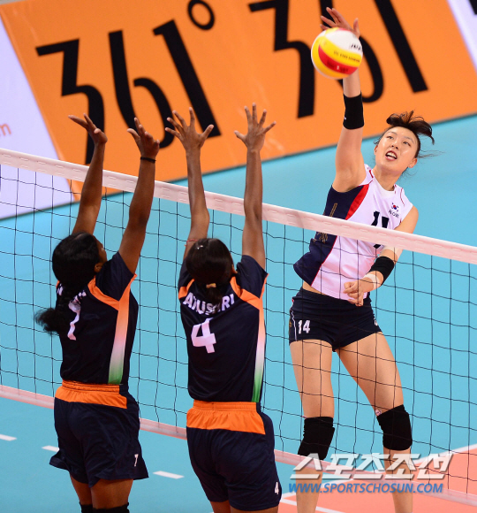 20일 오후 인천 송림체육관에서 2014 인천 아시안게임 여자 배구 한국과 인도의 경기가 열렸다. 한국 양효진이 인도 진영을 향해 공격을 시도하고 있다.