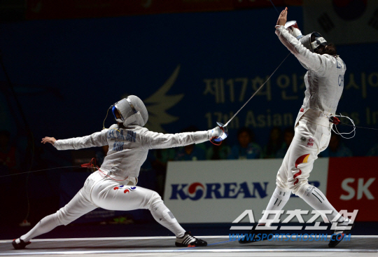 2014 인천아시안게임 펜싱 여자 사브르에 출전한 이라진이 준결승전에서 중국의 리 페이와 만났다. 20일 고양실내체육관에서 열린 경기에서 이라진(왼쪽)이 공격을 시도하고 있다.