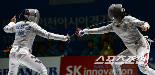 2014 인천아시안게임 펜싱 여자 사브르에 출전한 이라진이 준결승전에서 중국의 리 페이와 만났다. 20일 고양실내체육관에서 열린 경기에서 이라진(왼쪽)이 공격을 시도하고 있다.