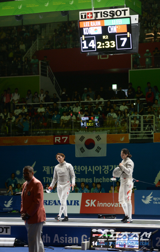 2014 인천아시안게임 펜싱 여자 사브르에 출전한 이라진이 준결승전에서 중국의 리 페이와 만났다. 20일 고양실내체육관에서 열린 경기에서 이라진(왼쪽)이 공격을 시도하고 있다.