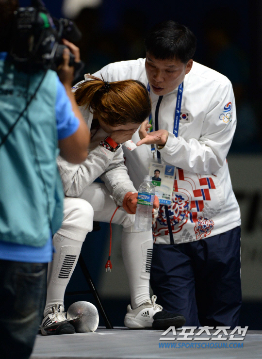 2014 인천아시안게임 펜싱 여자 사브르에 출전한 김지연이 준결승전에서 중국의 선천과 만났다. 20일 고양실내체육관에서 열린 경기에서 김지연이 1라운드를 마친 후 이수근 코치의 격려를 받고 있다.