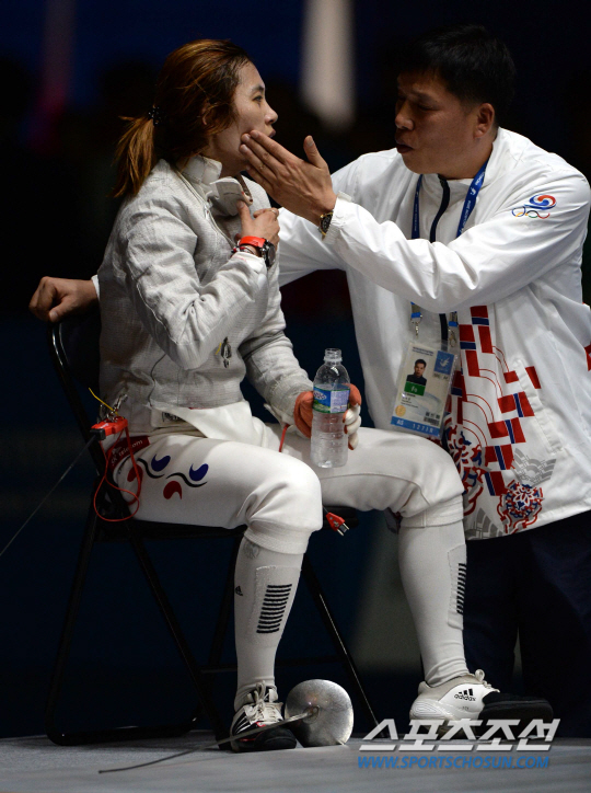 2014 인천아시안게임 펜싱 여자 사브르에 출전한 김지연이 준결승전에서 중국의 선천과 만났다. 20일 고양실내체육관에서 열린 경기에서 김지연이 1라운드를 마친 후 이수근 코치의 격려를 받고 있다.