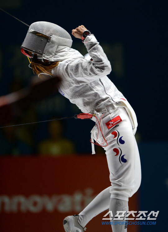 2014 인천아시안게임 펜싱 여자 사브르에 출전한 김지연이 준결승전에서 중국의 선천과 만났다. 20일 고양실내체육관에서 열린 경기에서 김지연이 승리하며 결승진출을 확정지은 후 기뻐하고 있다.