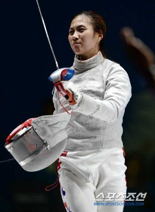 2014 인천아시안게임 펜싱 여자 사브르에 출전한 김지연이 준결승전에서 중국의 선천과 만났다. 20일 고양실내체육관에서 열린 경기에서 김지연이 승리하며 결승진출을 확정지은 후 기뻐하고 있다.