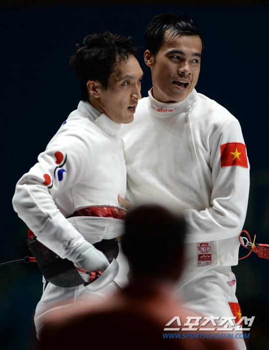 2014 인천아시안게임 펜싱 남자 에페에 출전한 박경두가 준결승전에서 베트남의 응위엔 티엔낫과 만났다. 20일 고양실내체육관에서 열린 경기에서 박경두가 승리하며 결승진출을 확정 지은 후 포옹을 하고 있다.