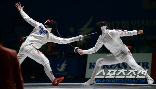 2014 인천아시안게임 펜싱 남자 에페에 출전한 정진선이 준결승전에서 싱가포르의 림웨이웬과 만났다. 20일 고양실내체육관에서 열린 경기에서 정진선(오른쪽)이 공격을 시도하고 있다.