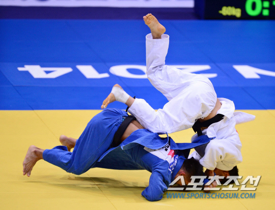 20일 오후 인천 송림체육관에서 2014 인천 아시안게임 유도 남자 -60kg 동메달 결정전이 열렸다. 한국 김원진(오른쪽)이 대만 밍엔에게 공격을 시도하고 있다.