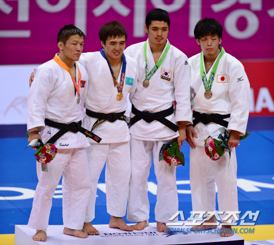 20일 오후 인천 송림체육관에서 2014 인천 아시안게임 유도 남자 -60kg 동메달 결정전이 열렸다. 대만 밍엔을 누르고 동메달을 획득한 한국 김원진(오른쪽에서 두번째)이 시상대에서 포즈를 취하고 있다.