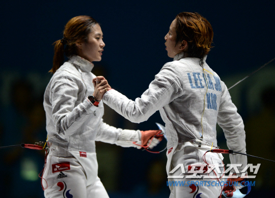 20일 고양체육관에서 열린 2014 인천아시안게임 펜싱 여자 사브르 김지연과 이라진의 결승전에서 이라진이 승리하며 금메달을 획득했다. 경기를 마친 두 선수가 포옹을 하고 있다.