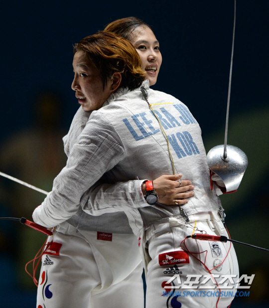 20일 고양체육관에서 열린 2014 인천아시안게임 펜싱 여자 사브르 김지연과 이라진의 결승전에서 이라진이 승리하며 금메달을 획득했다. 경기를 마친 두 선수가 포옹을 하고 있다.