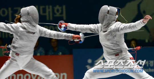 20일 고양체육관에서 열린 2014 인천아시안게임 펜싱 여자 사브르 김지연과 이라진의 결승전에서 이라진이 승리하며 금메달을 획득했다. 이라진(오른쪽)이 공격을 시도하고 있다.