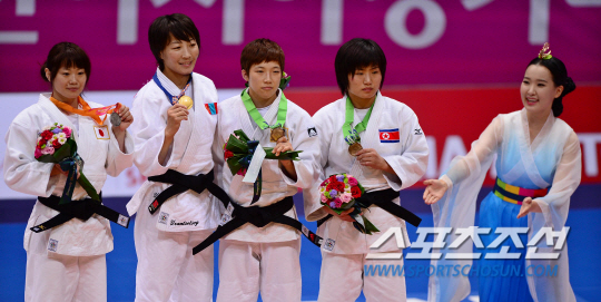 20일 오후 인천 송림체육관에서 2014 인천 아시안게임 유도 여자 -48kg 동메달 결정전이 열렸다. 시상식에서 동메달을 차지한 한국 정보경(왼쪽에서 두번째)과 북한 김솔미가 포즈를 취하고 있다.