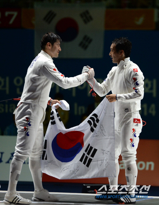 2014 인천아시안게임 펜싱 남자 에페에 출전한 정진선과 박경두가 결승전에서 만났다. 20일 고양실내체육관에서 열린 결승전 경기에서 정진선(왼쪽)이 승리하며 금메달을 획득했다. 경기 종료 후 두 선수가 태극기와 함께 포옹을 나누고 있다.