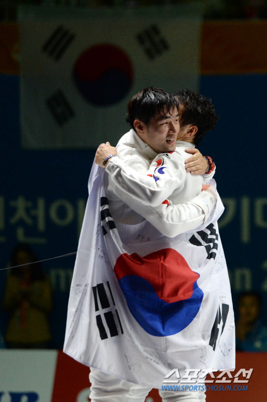 2014 인천아시안게임 펜싱 남자 에페에 출전한 정진선과 박경두가 결승전에서 만났다. 20일 고양실내체육관에서 열린 결승전 경기에서 정진선(왼쪽)이 승리하며 금메달을 획득했다. 경기 종료 후 두 선수가 태극기와 함께 포옹을 나누고 있다.