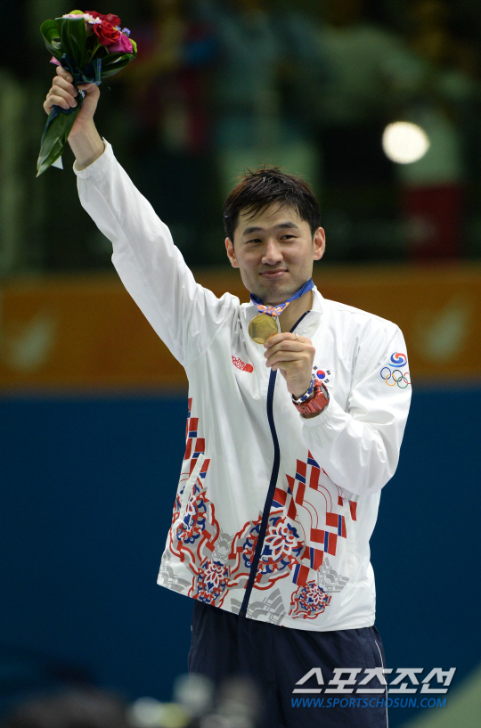 2014 인천아시안게임 펜싱 남자 에페에 출전한 정진선과 박경두가 결승전에서 만났다. 20일 고양실내체육관에서 열린 결승전 경기에서 정진선이 승리하며 금메달을 획득했다. 금메달을 들고 포즈를 취하는 정진선.