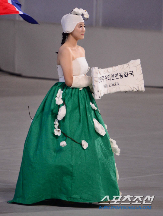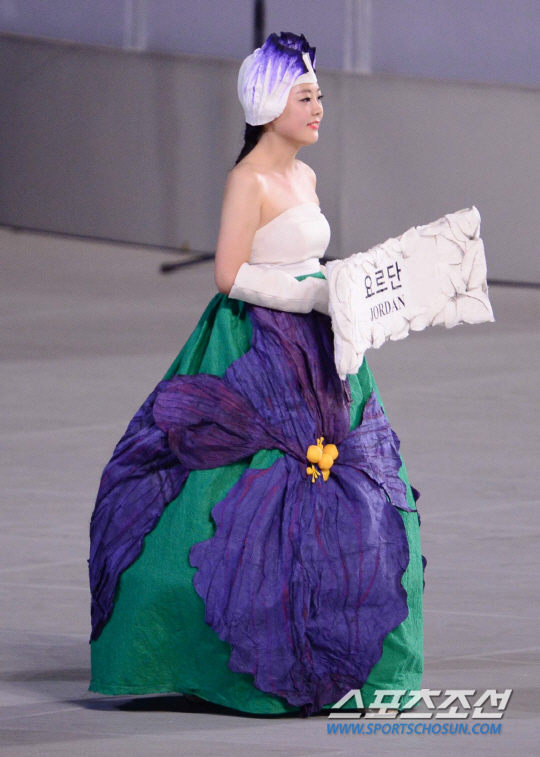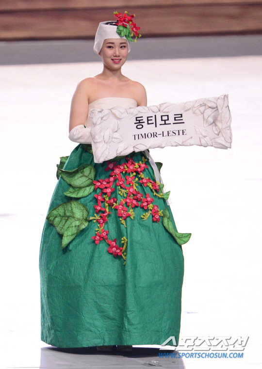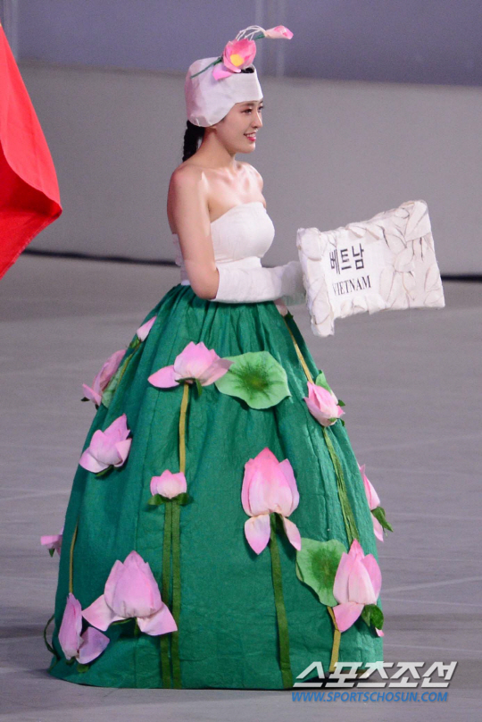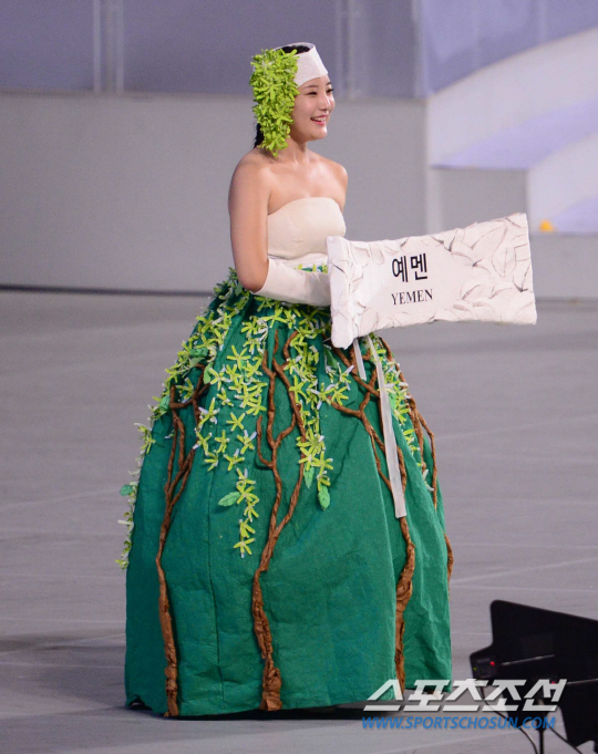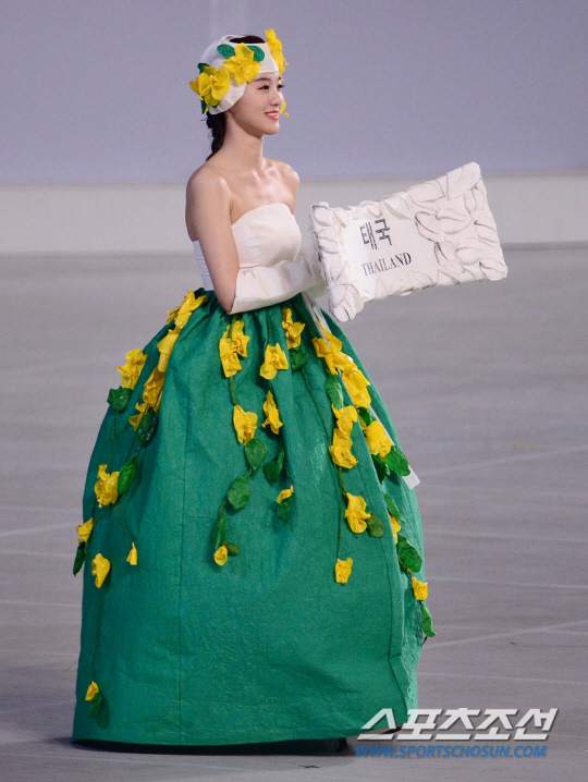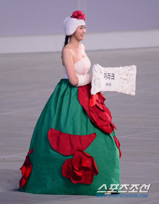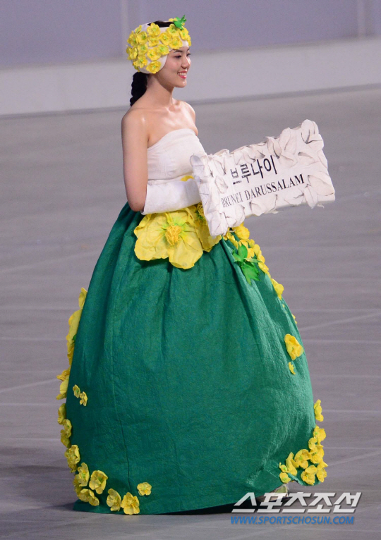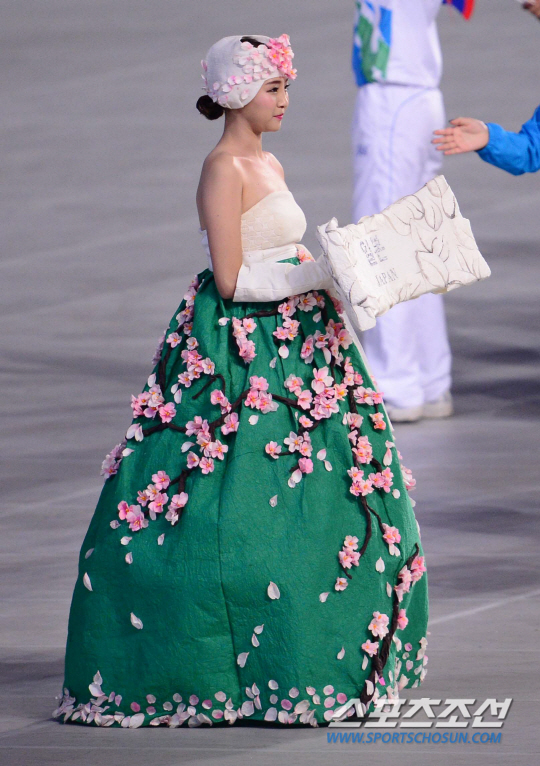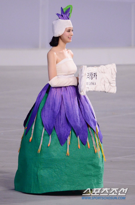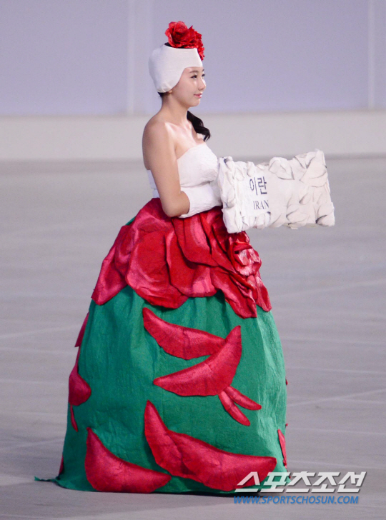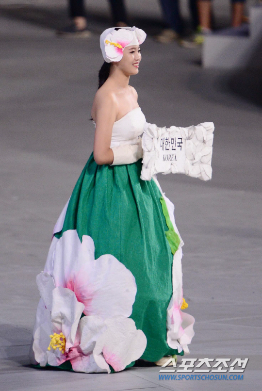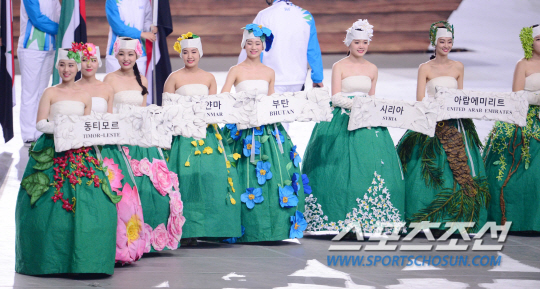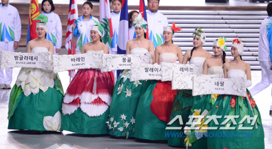 19일 인천 아시아드 주경기장에서 '45억 아시아인의 축제' 2014 인천아시안게임의 화려한 개회식이 열렸다. 많은 문화 공연과 K-POP 스타들의 화려한 공연 속에 또 다른 꽃이 있었으니...그것은 바로 개막식 피켓 요원들이었다. 개막식 피켓 요원으로는 경인여자대학교 항공관광과 학생들이 자원봉사를 해 주었다. 개막식 피켓요원들의 의상은 일반 원단이 아닌 한지를 이용한 한복으로 치마에는 45개 참가국을 상징하는 꽃과 식물 등이 장식됐다. 저고리 없이 치마로만 디자인된 변형 한복으로 쇄골 라인이 드러나는 튜브톱 드레스를 연상시키며 논란이 되기도 했지만 각국 선수단을 이끈 모습이 아름다웠다. 각국의 특색을 살린 피켓 요원들의 의상을 살펴보았다. 인천=김경민 기자 kyungmin@sportschosun.com