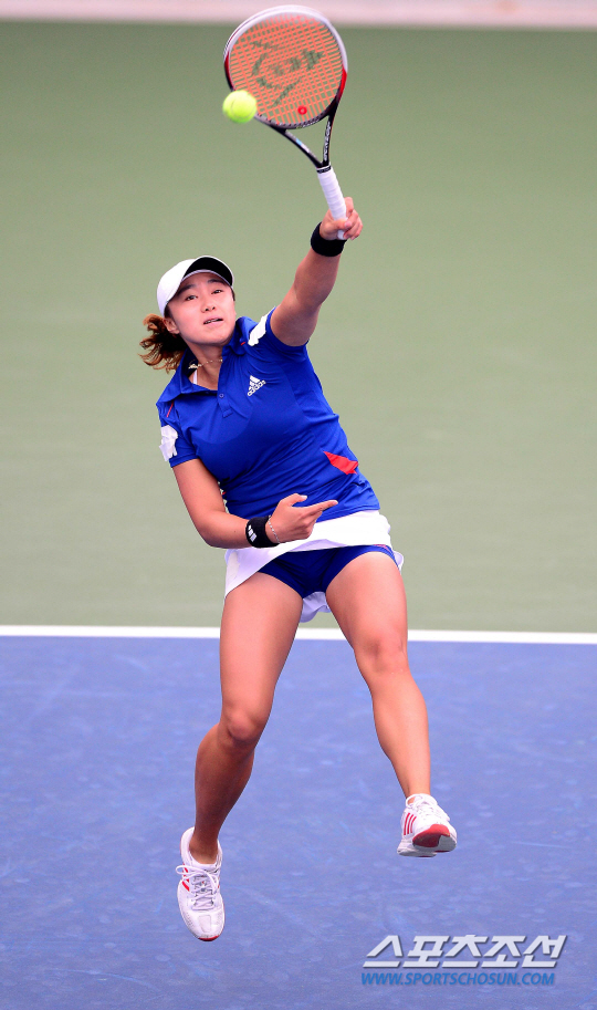 21일 오전 인천 열우물테니스장에서 2014 인천 아시안게임 테니스 여자 단체전 한국과 필리핀의 경기가 열렸다. 한국 한나래가 필리핀 DY 데니스를 향해 공격을 시도하고 있다.