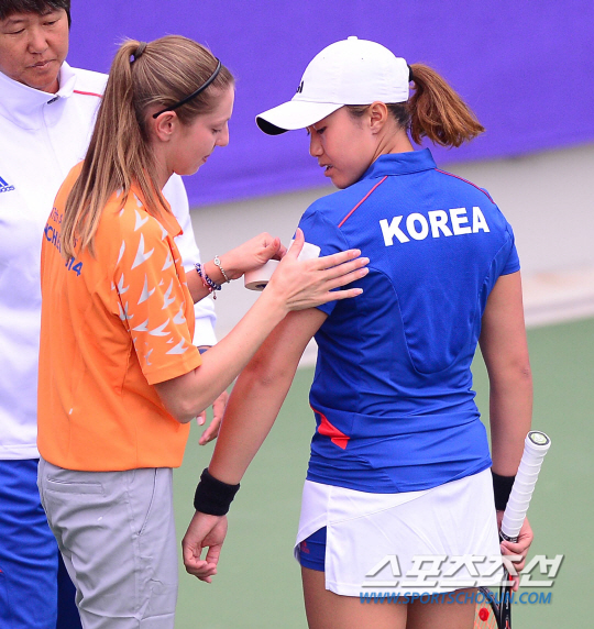 21일 오전 인천 열우물테니스장에서 2014 인천 아시안게임 테니스 여자 단체전 한국과 필리핀의 경기가 열렸다. 경기 전 심판이 대회 규정에 따라 한국 한나래 유니폼의 스폰서 광고에 테이핑을 하고 있다.
