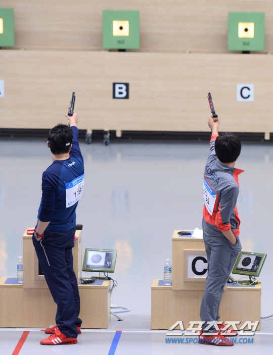 진종오와 김청용이 21일 인천 옥련국제사격장에서 열린 2014 인천아시안게임 사격 남자 10m공기권총 결선에 나란히 출전해 표적을 겨누고 있다. 이날, 진종오(35·KT)는 이대명(26·KB국민은행), 김청용(17·흥덕고)과 함께 사격 남자 10m 공기권총 단체전에서 1744점을 쏴 금메달을 차지했다. 김청용과 진종오는 본선에서 각각 4위와 7위를 차지해 결선무대에 섰다. 인천=최문영 기자 deer@sportschosun.com /2014.09.21/