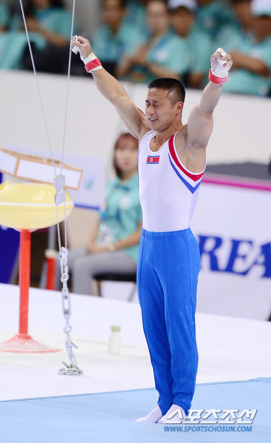 21일 오후 인천 남동체육관에서 2014 인천 아시안게임 체조 남자 개인 예선 및 단체 결승전이 열렸다. 북한 리세광이 링 연기를 펼치고 있다. 도마가 주 종목인 리세광은 자신의 이름을 딴 최고난도 6.4 기술인 '리세광'과 '드라굴레스쿠 파이크'를 주무기로 아시안게임에 출전했다..