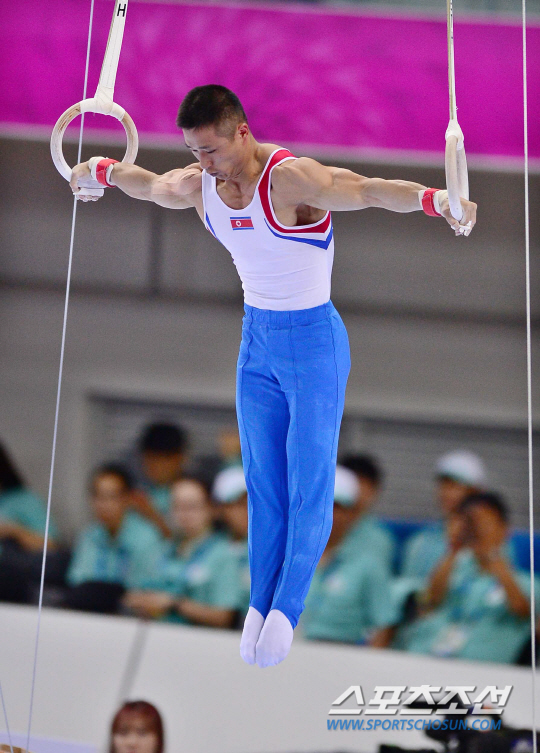 21일 오후 인천 남동체육관에서 2014 인천 아시안게임 체조 남자 개인 예선 및 단체 결승전이 열렸다. 북한 리세광이 링 연기를 펼치고 있다. 도마가 주 종목인 리세광은 자신의 이름을 딴 최고난도 6.4 기술인 '리세광'과 '드라굴레스쿠 파이크'를 주무기로 아시안게임에 출전했다..