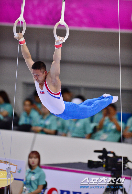 21일 오후 인천 남동체육관에서 2014 인천 아시안게임 체조 남자 개인 예선 및 단체 결승전이 열렸다. 북한 리세광이 링 연기를 펼치고 있다. 도마가 주 종목인 리세광은 자신의 이름을 딴 최고난도 6.4 기술인 '리세광'과 '드라굴레스쿠 파이크'를 주무기로 아시안게임에 출전했다..