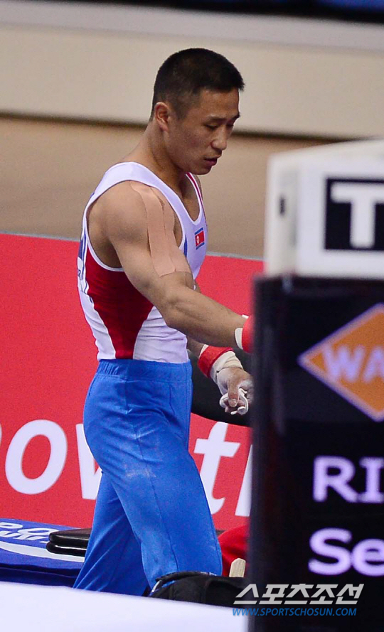 21일 오후 인천 남동체육관에서 2014 인천 아시안게임 체조 남자 개인 예선 및 단체 결승전이 열렸다. 북한 리세광이 링 연기를 마친 후 자리로 들어가고 있다. 도마가 주 종목인 리세광은 자신의 이름을 딴 최고난도 6.4 기술인 '리세광'과 '드라굴레스쿠 파이크'를 주무기로 아시안게임에 출전했다.