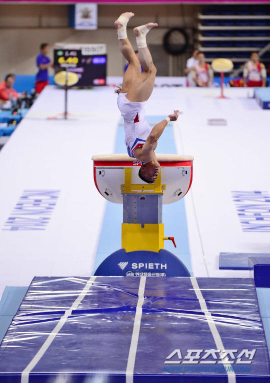 21일 오후 인천 남동체육관에서 2014 인천 아시안게임 체조 남자 개인 예선 및 단체 결승전이 열렸다. 북한 리세광이 도마 연기를 펼치고 있다. 리세광은 자신의 이름을 딴 최고난도 6.4 기술인 '리세광'과 '드라굴레스쿠 파이크'를 주무기로 아시안게임에 출전했다.