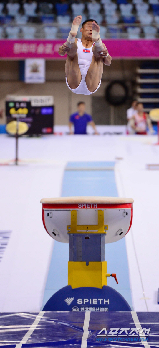 21일 오후 인천 남동체육관에서 2014 인천 아시안게임 체조 남자 개인 예선 및 단체 결승전이 열렸다. 북한 리세광이 도마 연기를 펼치고 있다. 리세광은 자신의 이름을 딴 최고난도 6.4 기술인 '리세광'과 '드라굴레스쿠 파이크'를 주무기로 아시안게임에 출전했다.