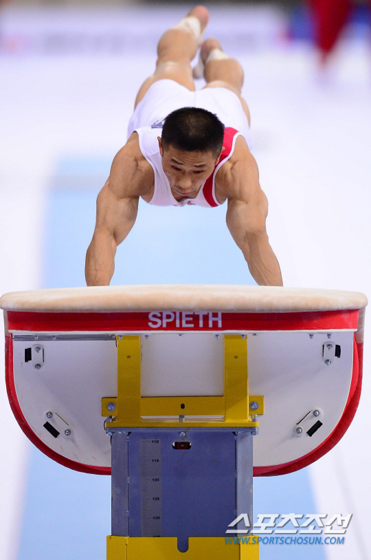 21일 오후 인천 남동체육관에서 2014 인천 아시안게임 체조 남자 개인 예선 및 단체 결승전이 열렸다. 북한 리세광이 도마 연기를 펼치고 있다. 리세광은 자신의 이름을 딴 최고난도 6.4 기술인 '리세광'과 '드라굴레스쿠 파이크'를 주무기로 아시안게임에 출전했다.