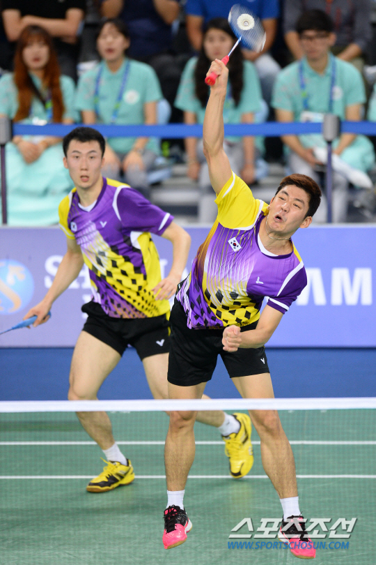 한국의 이용대와 유연성이 21일 인천 계양체육관에서 벌어진 2014 인천아시안게임 배드민턴 단체전 8강전에서 일본의 엔도- 하야가와조를 상대로 강력한 스매싱 공격을 하고있다.