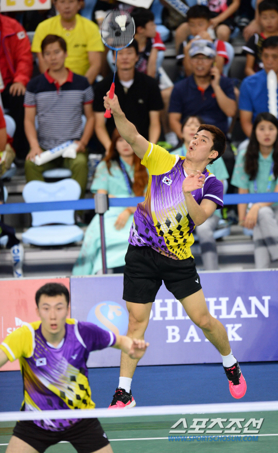 한국의 이용대와 유연성이 21일 인천 계양체육관에서 벌어진 2014 인천아시안게임 배드민턴 단체전 8강전에서 일본의 엔도- 하야가와조를 상대로 강력한 스매싱 공격을 하고있다.