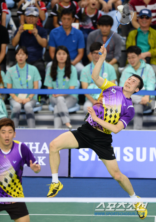 한국의 이용대와 유연성이 21일 인천 계양체육관에서 벌어진 2014 인천아시안게임 배드민턴 단체전 8강전에서 일본의 엔도- 하야가와조를 상대로 강력한 스매싱 공격을 하고있다.