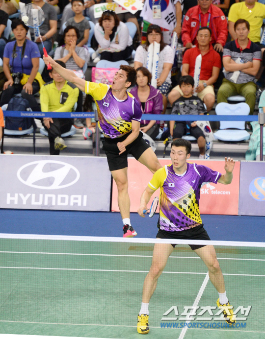 한국의 이용대와 유연성이 21일 인천 계양체육관에서 벌어진 2014 인천아시안게임 배드민턴 단체전 8강전에서 일본의 엔도- 하야가와조를 상대로 강력한 스매싱 공격을 하고있다.