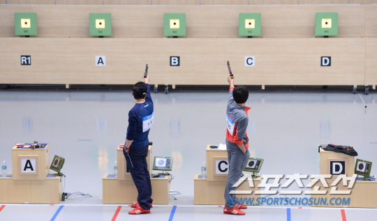 진종오와 김청용이 21일 인천 옥련국제사격장에서 열린 2014 인천아시안게임 사격 남자 10m공기권총 결선에 나란히 출전해 표적을 겨누고 있다.