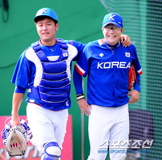 21일 오후 인천 문학야구장에서 2014 인천 아시안게임 야구대표팀의 공식 훈련이 열렸다. 대표팀 강민호(왼쪽)와 양현종이 이야기를 나누고 있다.
