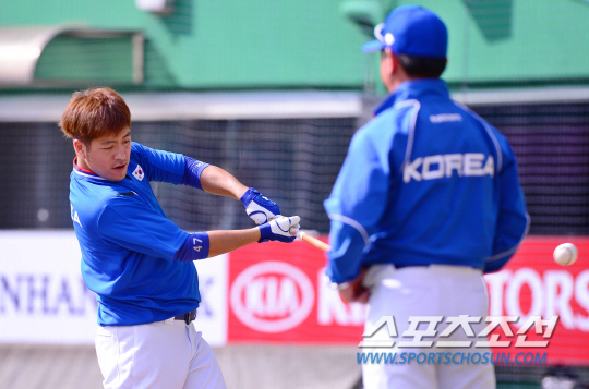 21일 오후 인천 문학야구장에서 2014 인천 아시안게임 야구대표팀의 공식 훈련이 열렸다. 대표팀 강민호가 류중일 감독이 지켜보는 가운데 타격 훈련을 하고 있다.