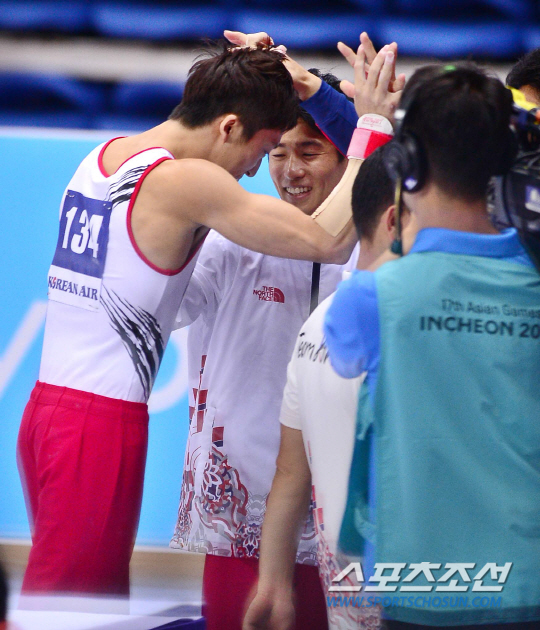 21일 오후 인천 남동체육관에서 2014 인천 아시안게임 체조 남자 개인 예선 및 단체 결승전이 열렸다. 양학선이 안마 연기를 마친 신동현과 기뻐하고 있다.