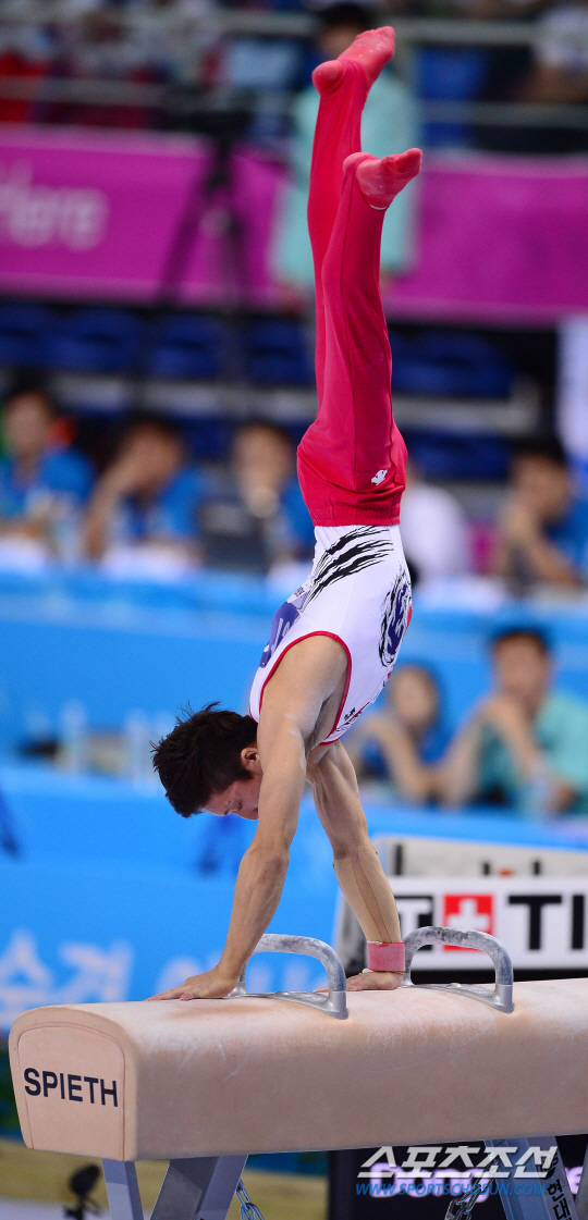 21일 오후 인천 남동체육관에서 2014 인천 아시안게임 체조 남자 개인 예선 및 단체 결승전이 열렸다. 한국 신동현이 안마 연기를 하고 있다.