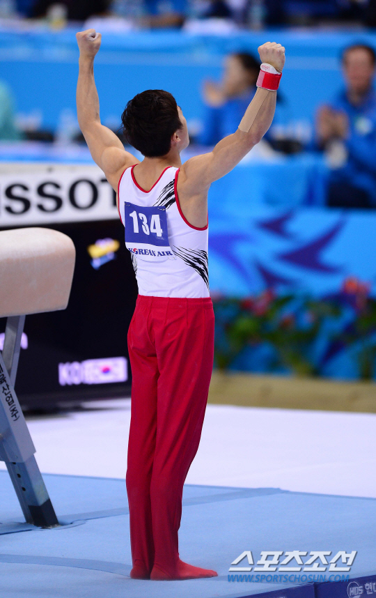 21일 오후 인천 남동체육관에서 2014 인천 아시안게임 체조 남자 개인 예선 및 단체 결승전이 열렸다. 한국 신동현이 안마 연기를 하고 있다.