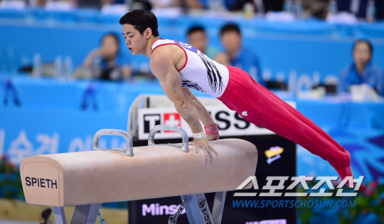 21일 오후 인천 남동체육관에서 2014 인천 아시안게임 체조 남자 개인 예선 및 단체 결승전이 열렸다. 한국 박민수가 안마 연기를 하고 있다.