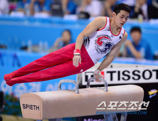 21일 오후 인천 남동체육관에서 2014 인천 아시안게임 체조 남자 개인 예선 및 단체 결승전이 열렸다. 한국 박민수가 안마 연기를 하고 있다.