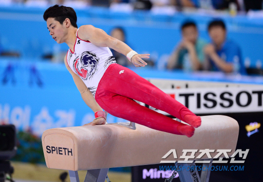 21일 오후 인천 남동체육관에서 2014 인천 아시안게임 체조 남자 개인 예선 및 단체 결승전이 열렸다. 한국 박민수가 안마 연기를 하고 있다.