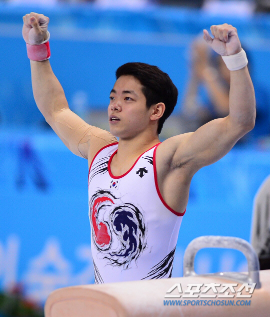 21일 오후 인천 남동체육관에서 2014 인천 아시안게임 체조 남자 개인 예선 및 단체 결승전이 열렸다. 한국 박민수가 안마 연기를 하고 있다.